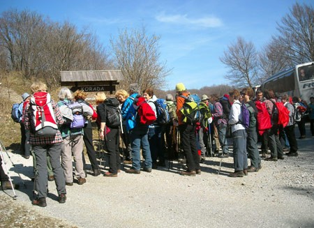 Pri Solkanu smo se po strmi in ozki obokani Osimski cesti peljali v smeri proti Vrhovljam in naprej proti vznožju najvišjega vrha v Goriških Brdih - Koradi. Šoferja avtobusov sta spretno vijugala po cesti, ki je bolj spominjala na ozko stezo za bob in nas pripeljala visoko nad dolino. Na parkirišču , kjer je bilo pravo razkošje prostora za oba avtobusa, smo izstopili. Z veseljem in v velikem pričakovanju smo se odpravili na pot.