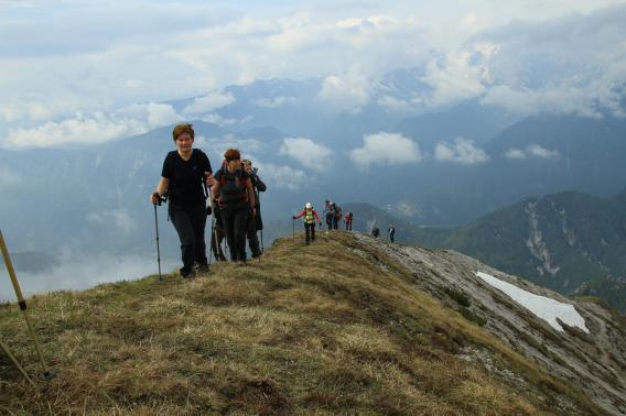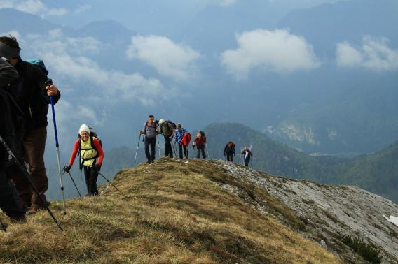 Spustimo se nazaj v sonce, ki nas greje, in se razgledujemo po vrhovih Triglavskega pogorja in Karavank.