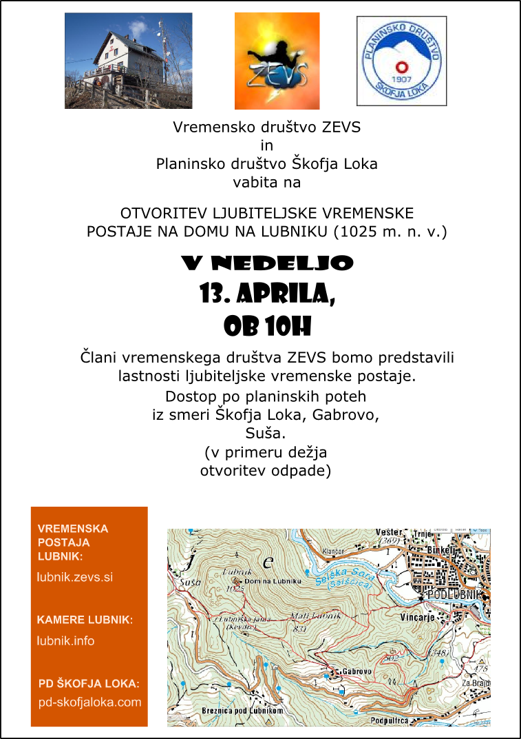 V nedeljo, 13. aprila, bo na Lubniku potekala otvoritev ljubiteljske vremenske postaje vremenskega društva ZEVS. Vljubno vabljeni!