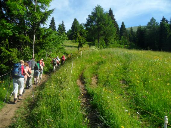 Tokrat se nas je zbralo devet pohodnikov. Pričakalo nas je sončno jutro in z veseljem smo se podali na pot. Avtomobila smo parkirali pri gostišču Betel na Planini pod Golico, potem pa smo se spopadli s strmino pred nami. Na spodnjih travnih žal narcis ni več, ker so za letos že odcvetele. Le tu in tam je še kakšna samevala. Smo pa lahko občudovali cvetja polne travnike, ki jih v dolini najdemo le še malo kje. V dolini se namreč kmetom vse preveč mudi s košnjo, tako da rože niti zacveteti ne morejo.