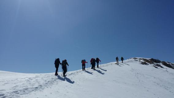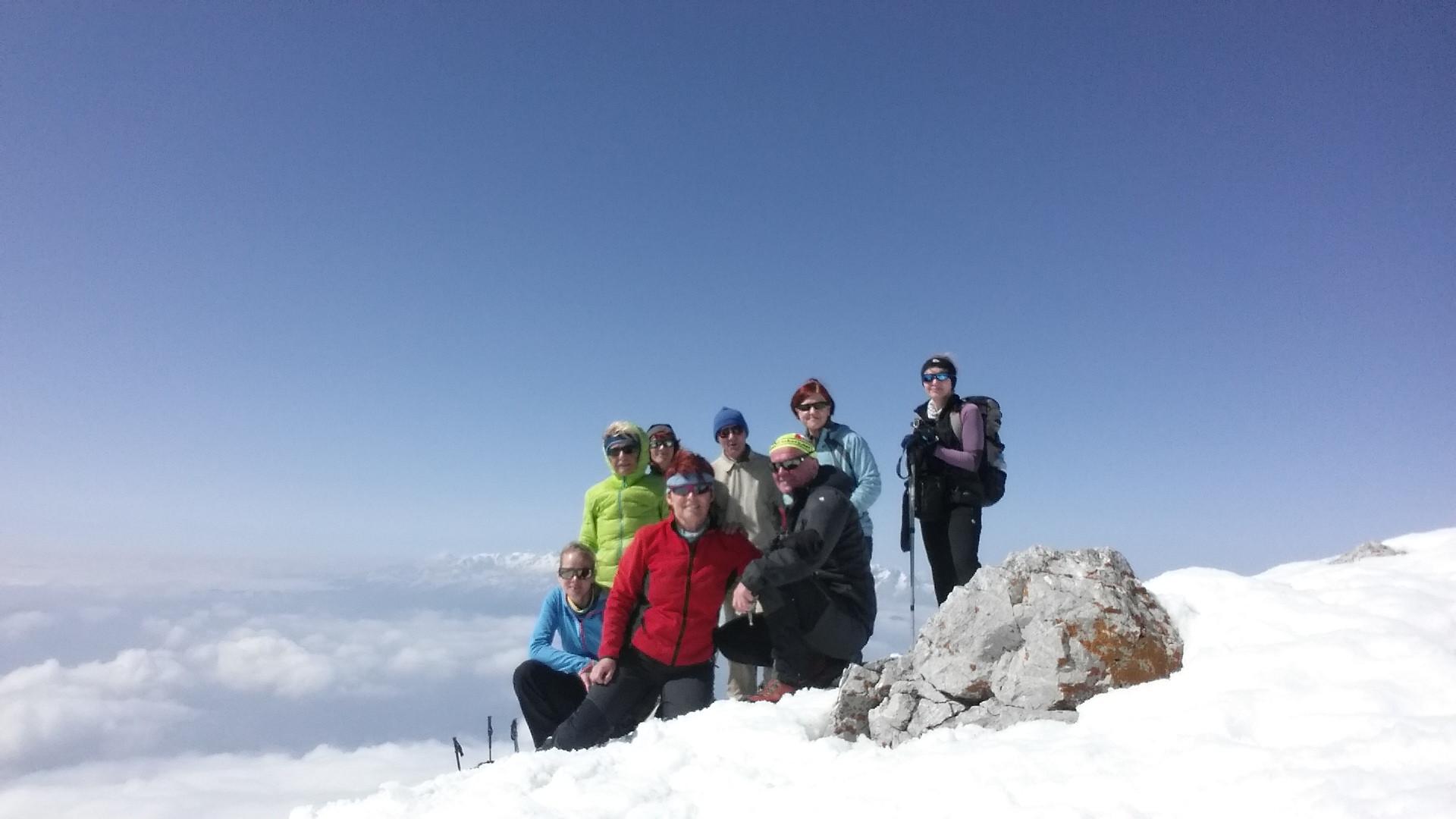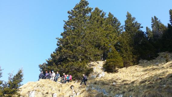 Pripeljali smo se do Valvazorjeve koče in se v strnjeni kolonici usmerili po Završniški poti. Snega je bilo zelo malo, tako da smo opremo bolj nosili kot uporabljali. Sneg je bil prijetno mehak pod toplimi sončnimi žarki in nam je omogočal varen in hiter korak. V slabih treh urah smo dosegli vrh in si nato pri koči privoščili zasluženo klobaso.