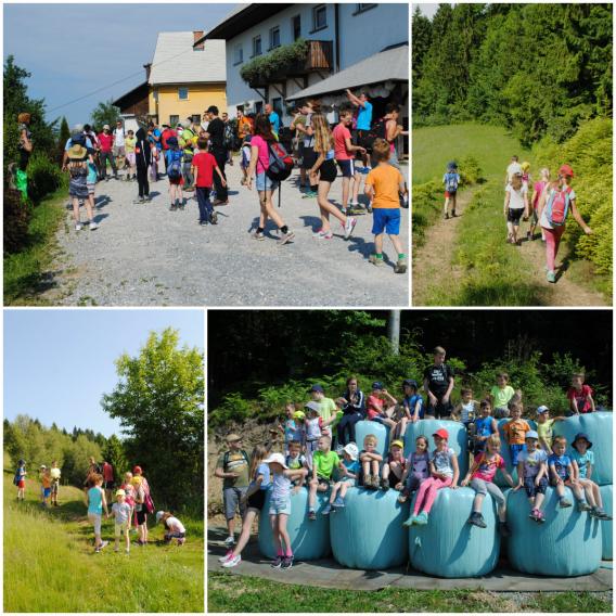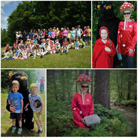 Po krajšem izletu, saj je bilo z nami kar nekaj sila mladih planincev, smo se po krožni poti vrnili proti domačiji Pri Pešarju. Tik pred Pešarjevim gričem pa so nas v gozdu presenetili prijazni medo, mušnica in Rdeča Kapica, ki je iskala pot do svoje babice. Sladke dobrote, s katerimi so nas postregli, so šle dobro v promet, zato so otroci z veseljem zapeli pesmico.