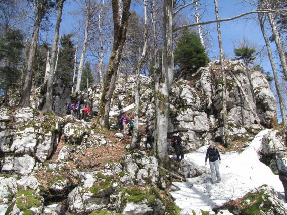 Najprej smo se povzpeli na 1077 m visok Kameni zid. Vznožje gore je krasila preproga pomladanskega cvetja, ob strmi poti pa je ležalo veliko podrtega drevja. S Kamenega zidu, izredno razglednega vrha, smo turo nadaljevali po planoti Goteniške gore. Del poti je prekrivala snežna odeja, sledi pa so pričale, da na tem območju živijo medvedi, ki so se ravnokar prebudili z zimskega spanja. Prve sledi so kazale, da se je kosmatinec ravnokar sprehodil čez našo pot in si brusil kremplje ob debelo deblo. Sledi medvedov smo opazili tudi tik pod vrhom Goteniškega Snežnika, kjer se je sprehajala tudi medvedka z mladičem.